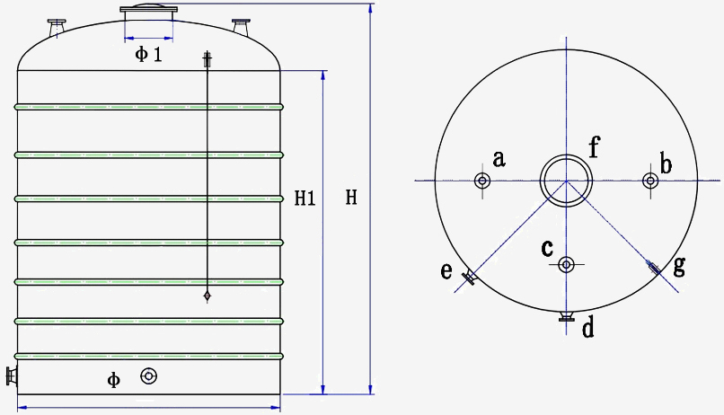 公稱容積(M³) 直徑 總高 垂高(gāo) 人孔(kǒng)直徑 標準進出口接口(DN)