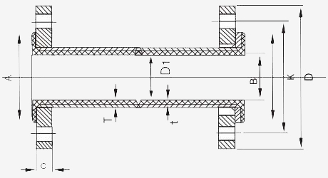 公稱直徑DN | 鋼管(guǎn)規格T | 密封麵A | 孔徑D1 | 密封麵厚(hòu)t | 四氟管(guǎn)外徑B | 法蘭(lán)外徑D | 法蘭中心距K | 法蘭厚(hòu)度C | 襯裏厚 | 總(zǒng)長公差(chà) |